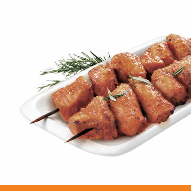 Product prepared from poultry meat cut into cubes, which after its mixed with a comercial prepare is marinated and finally pricked on bamboo sticks to be packaged.